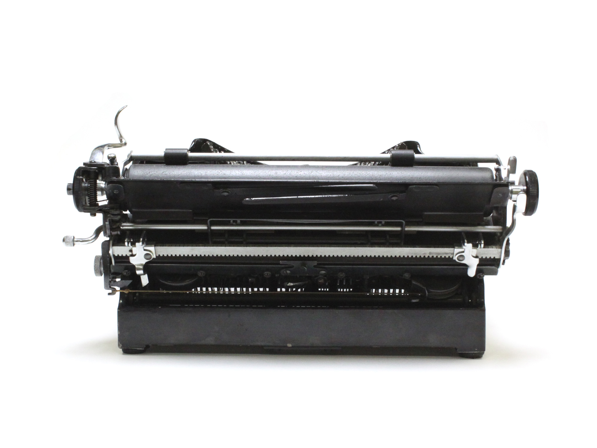 Эта машинка — одна из самых лёгких и компактных с четырёхрядной клавиатурой, выпущенных в 30-е годы прошлого века. При этом оригинальный дизайн аппарата заставляет ценителей ретро рассматривать его со всех сторон.Необычное решение производителей — интервальный рычаг. Он установлен на каретке справа. Кроме того, замок регистра (Caps lock) выполнен не в виде клавиши, а в форме рычажка (выполняет свою функцию таким же образом, как и обычная клавиша).Машинка отремонтирована, почищена, смазана, отрегулирована, протестирована. Заправлена свежая двухцветная лента.Машинка оснащена всеми необходимыми функциями и опциями. К ним относятся: включение и выключение трещотки, три позиции междустрочного интервала, освобождение бумаги, выставление полей и их отключение, двухцветная печать, звонок, предупреждающий о конце строки, фиксация регистра (Caps Lock).Раскладка ЙЦУКЕН, адаптирована под современную раскладку для письма на русском языке. Цифры 3 и 0 набираются заглавными буквами "З" и "О", которые по своему рисунку совпадают с изображениями этих числовых обозначений.Машинка комплектуется футляром. Кейс представляет собой днище и съёмную крышку. Машинка может быть откручена от днища или работать прямо на нём. Линия строки ровная, шрифт мелкий, с воздухом между символами, удобочитаемый.___
